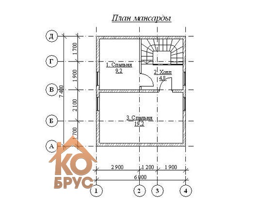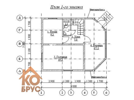 Проект ДБ-56 — это дом из бруса размером 7×9 метров с полноценным первым этажом и мансардой. Основные стены первого уровня выполнены из бруса 150×150 мм, высота этажа составляет 3 метра (2,70 м в чистоте). Высота мансардного этажа — 2,50 м в чистоте. Внутренние перегородки на первом этаже изготавливаются из бруса 100×150 мм.