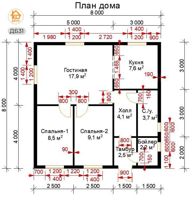 Проект тёплого и компактного дома из бруса 8×8 м — идеальное решение для семьи, ценящей комфорт и функциональность. Планировка включает две уютные спальни, просторную гостиную с прямым выходом в кухню, отдельный санузел, тамбур и техническое помещение для котла — всё продумано для круглогодичного проживания. Центральная зона объединяет семью, а приватная половина обеспечивает личное пространство. Минимум лишних коридоров — максимум полезных метров и рациональное расходование бюджета на строительство. Отличный выбор для дачи, загородной жизни или аренды.